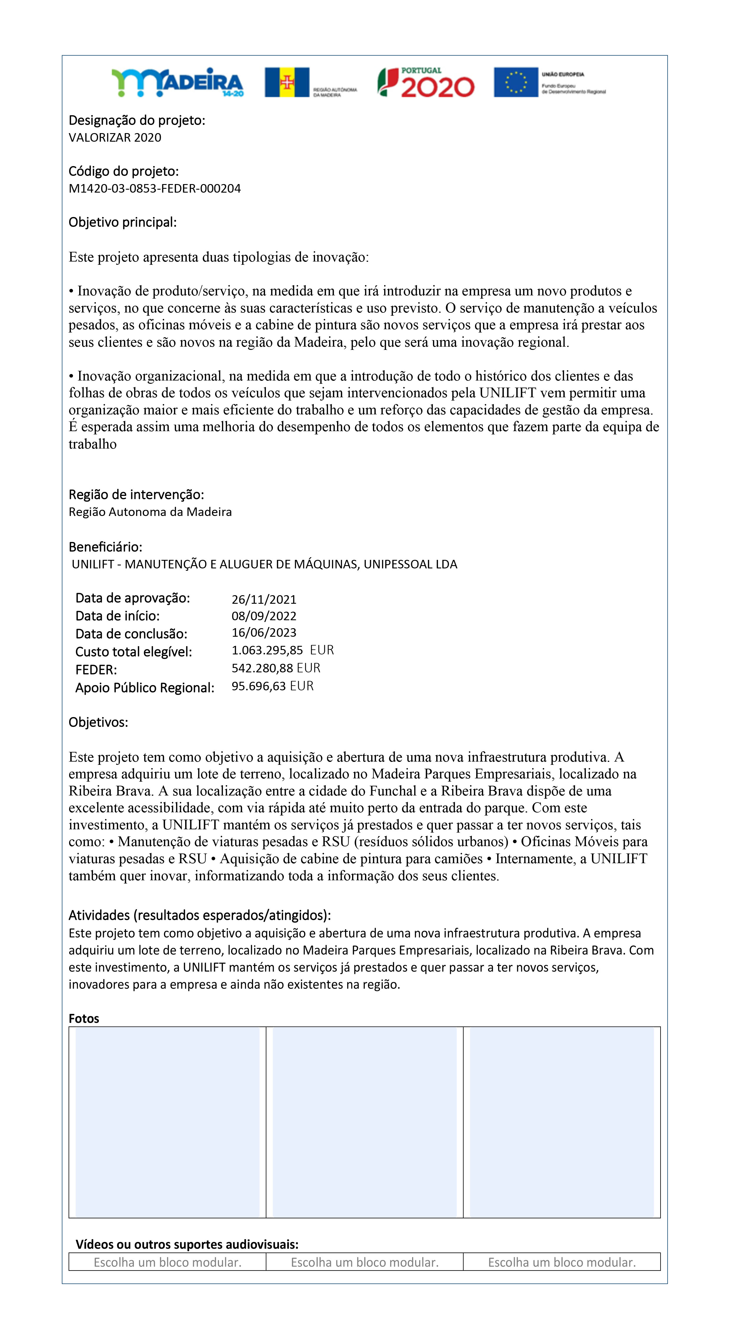 Com este investimento, a UNILIFT mantém os serviços já prestados e quer passar a ter novos serviços, inovadores para a empresa e ainda não existentes na região.
